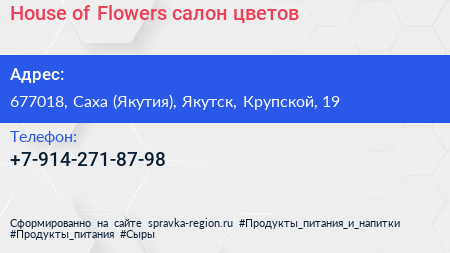 House of Flowers, салон цветов по адресу 677018, Саха (Якутия), Якутск, Крупской, 19 в дальнейшем Организация, размещена в следующих категориях: