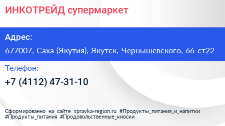 ИНКОТРЕЙД, супермаркет по адресу 677007, Саха (Якутия), Якутск, Чернышевского, 66 ст22 в дальнейшем Организация, размещена в следующих категориях:
