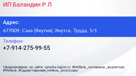 ИП Баландин Р.Л. по адресу 677009, Саха (Якутия), Якутск, Труда, 5/1 в дальнейшем Организация, размещена в следующих категориях: