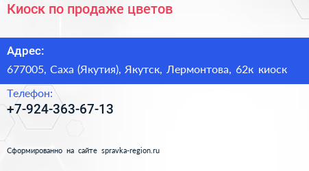 Киоск по продаже цветов по адресу 677005, Саха (Якутия), Якутск, Лермонтова, 62к киоск в дальнейшем Организация, размещена в следующих категориях: