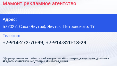 Мамонт, рекламное агентство по адресу 677027, Саха (Якутия), Якутск, Петровского, 19 в дальнейшем Организация, размещена в следующих категориях: