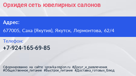 Орхидея, сеть ювелирных салонов по адресу 677005, Саха (Якутия), Якутск, Лермонтова, 62/4 в дальнейшем Организация, размещена в следующих категориях: