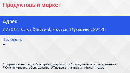 Продуктовый маркет по адресу 677014, Саха (Якутия), Якутск, Кузьмина, 29/2Б в дальнейшем Организация, размещена в следующих категориях: