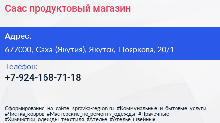 Саас, продуктовый магазин по адресу 677000, Саха (Якутия), Якутск, Пояркова, 20/1 в дальнейшем Организация, размещена в следующих категориях: