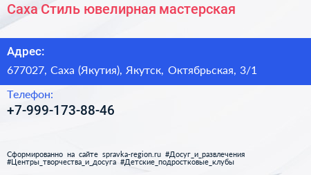 Саха Стиль, ювелирная мастерская по адресу 677027, Саха (Якутия), Якутск, Октябрьская, 3/1 в дальнейшем Организация, размещена в следующих категориях: