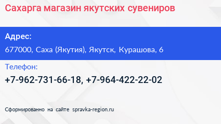 Сахарга, магазин якутских сувениров по адресу 677000, Саха (Якутия), Якутск, Курашова, 6 в дальнейшем Организация, размещена в следующих категориях: