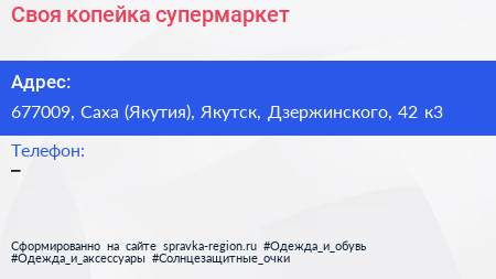 Своя копейка, супермаркет по адресу 677009, Саха (Якутия), Якутск, Дзержинского, 42 к3 в дальнейшем Организация, размещена в следующих категориях: