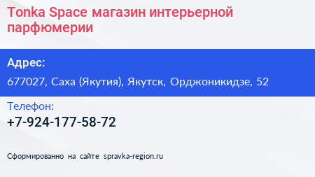 Tonka Space, магазин интерьерной парфюмерии по адресу 677027, Саха (Якутия), Якутск, Орджоникидзе, 52 в дальнейшем Организация, размещена в следующих категориях: