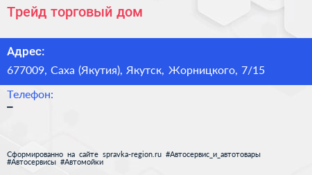 Трейд, торговый дом по адресу 677009, Саха (Якутия), Якутск, Жорницкого, 7/15 в дальнейшем Организация, размещена в следующих категориях: