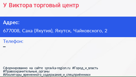 У Виктора, торговый центр по адресу 677008, Саха (Якутия), Якутск, Чайковского, 2 в дальнейшем Организация, размещена в следующих категориях: