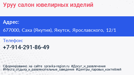 Уруу, салон ювелирных изделий по адресу 677000, Саха (Якутия), Якутск, Ярославского, 12/1 в дальнейшем Организация, размещена в следующих категориях:
