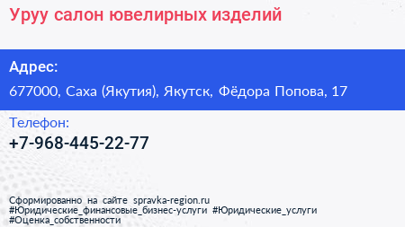 Уруу, салон ювелирных изделий по адресу 677000, Саха (Якутия), Якутск, Фёдора Попова, 17 в дальнейшем Организация, размещена в следующих категориях: