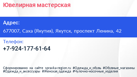 Ювелирная мастерская по адресу 677007, Саха (Якутия), Якутск, проспект Ленина, 42 в дальнейшем Организация, размещена в следующих категориях: