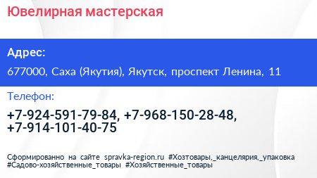 Ювелирная мастерская по адресу 677000, Саха (Якутия), Якутск, проспект Ленина, 11 в дальнейшем Организация, размещена в следующих категориях: