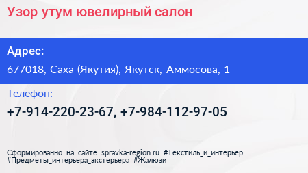 Узор утум, ювелирный салон по адресу 677018, Саха (Якутия), Якутск, Аммосова, 1 в дальнейшем Организация, размещена в следующих категориях: