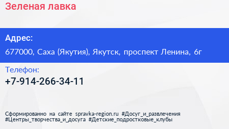 Зеленая лавка по адресу 677000, Саха (Якутия), Якутск, проспект Ленина, 6г в дальнейшем Организация, размещена в следующих категориях: