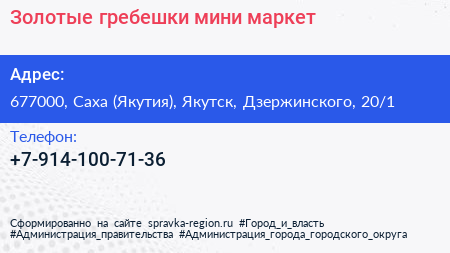 Золотые гребешки, мини-маркет по адресу 677000, Саха (Якутия), Якутск, Дзержинского, 20/1 в дальнейшем Организация, размещена в следующих категориях: