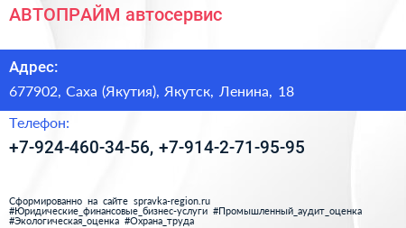 АВТОПРАЙМ, автосервис по адресу 677902, Саха (Якутия), Якутск, Ленина, 18 в дальнейшем Организация, размещена в следующих категориях: