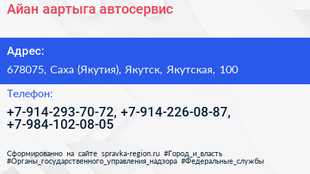 Айан аартыга, автосервис по адресу 678075, Саха (Якутия), Якутск, Якутская, 100 в дальнейшем Организация, размещена в следующих категориях: