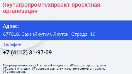 Якутагропромтехпроект, проектная организация по адресу 677018, Саха (Якутия), Якутск, Строда, 16 в дальнейшем Организация, размещена в следующих категориях: