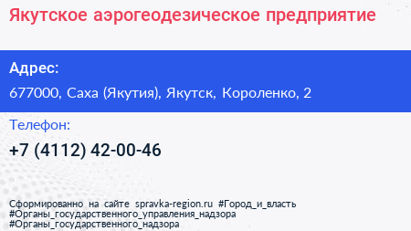 Якутское аэрогеодезическое предприятие по адресу 677000, Саха (Якутия), Якутск, Короленко, 2 в дальнейшем Организация, размещена в следующих категориях: