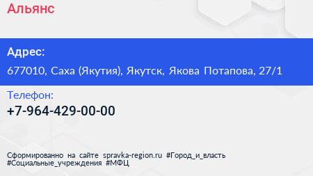 Альянс+ по адресу 677010, Саха (Якутия), Якутск, Якова Потапова, 27/1 в дальнейшем Организация, размещена в следующих категориях: