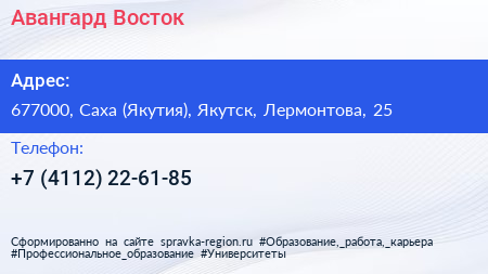 Авангард-Восток по адресу 677000, Саха (Якутия), Якутск, Лермонтова, 25 в дальнейшем Организация, размещена в следующих категориях: