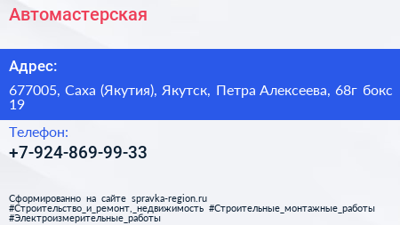 Автомастерская по адресу 677005, Саха (Якутия), Якутск, Петра Алексеева, 68г бокс 19 в дальнейшем Организация, размещена в следующих категориях: