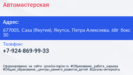 Автомастерская по адресу 677005, Саха (Якутия), Якутск, Петра Алексеева, 68г бокс 30 в дальнейшем Организация, размещена в следующих категориях: