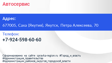 Автосервис по адресу 677005, Саха (Якутия), Якутск, Петра Алексеева, 70 в дальнейшем Организация, размещена в следующих категориях: