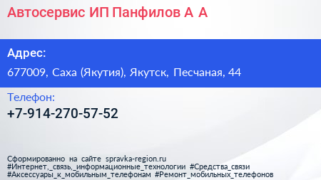 Автосервис, ИП Панфилов А.А. по адресу 677009, Саха (Якутия), Якутск, Песчаная, 44 в дальнейшем Организация, размещена в следующих категориях: