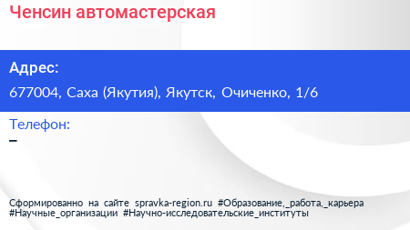 Ченсин, автомастерская по адресу 677004, Саха (Якутия), Якутск, Очиченко, 1/6 в дальнейшем Организация, размещена в следующих категориях: