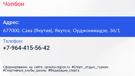 Чолбон по адресу 677000, Саха (Якутия), Якутск, Орджоникидзе, 36/1 в дальнейшем Организация, размещена в следующих категориях: