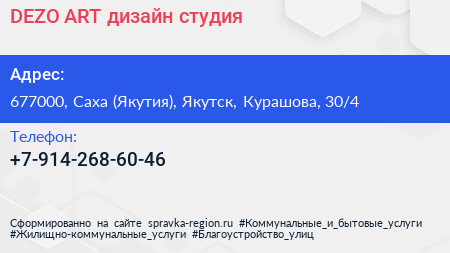 DEZO.ART, дизайн-студия по адресу 677000, Саха (Якутия), Якутск, Курашова, 30/4 в дальнейшем Организация, размещена в следующих категориях: