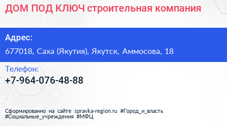 ДОМ ПОД КЛЮЧ, строительная компания по адресу 677018, Саха (Якутия), Якутск, Аммосова, 18 в дальнейшем Организация, размещена в следующих категориях:
