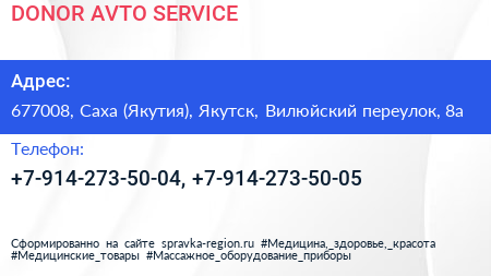DONOR AVTO SERVICE по адресу 677008, Саха (Якутия), Якутск, Вилюйский переулок, 8а в дальнейшем Организация, размещена в следующих категориях: