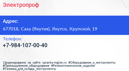 Электропроф по адресу 677018, Саха (Якутия), Якутск, Крупской, 19 в дальнейшем Организация, размещена в следующих категориях: