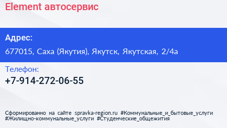 Element, автосервис по адресу 677015, Саха (Якутия), Якутск, Якутская, 2/4а в дальнейшем Организация, размещена в следующих категориях:
