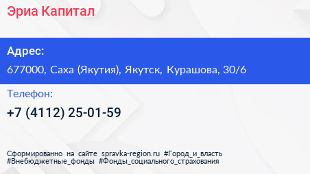 Эриа Капитал по адресу 677000, Саха (Якутия), Якутск, Курашова, 30/6 в дальнейшем Организация, размещена в следующих категориях:
