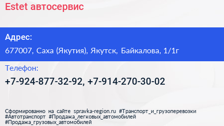 Estet, автосервис по адресу 677007, Саха (Якутия), Якутск, Байкалова, 1/1г в дальнейшем Организация, размещена в следующих категориях: