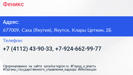 Феникс по адресу 677009, Саха (Якутия), Якутск, Клары Цеткин, 2Б в дальнейшем Организация, размещена в следующих категориях: