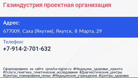 Газиндустрия, проектная организация по адресу 677009, Саха (Якутия), Якутск, 8 Марта, 29 в дальнейшем Организация, размещена в следующих категориях: