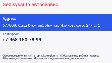 Genisysauto, автосервис по адресу 677008, Саха (Якутия), Якутск, Чайковского, 2/7 ст1 в дальнейшем Организация, размещена в следующих категориях: