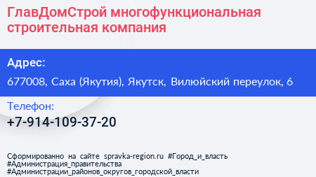 ГлавДомСтрой, многофункциональная строительная компания по адресу 677008, Саха (Якутия), Якутск, Вилюйский переулок, 6 в дальнейшем Организация, размещена в следующих категориях: