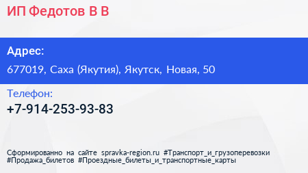 ИП Федотов В.В. по адресу 677019, Саха (Якутия), Якутск, Новая, 50 в дальнейшем Организация, размещена в следующих категориях: