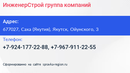 ИнженерСтрой, группа компаний по адресу 677027, Саха (Якутия), Якутск, Ойунского, 3 в дальнейшем Организация, размещена в следующих категориях: