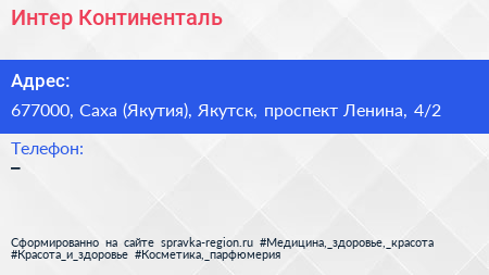 Интер-Континенталь по адресу 677000, Саха (Якутия), Якутск, проспект Ленина, 4/2 в дальнейшем Организация, размещена в следующих категориях: