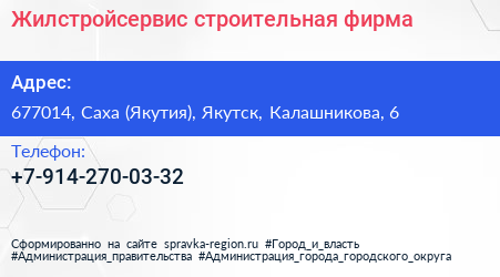 Жилстройсервис, строительная фирма по адресу 677014, Саха (Якутия), Якутск, Калашникова, 6 в дальнейшем Организация, размещена в следующих категориях: