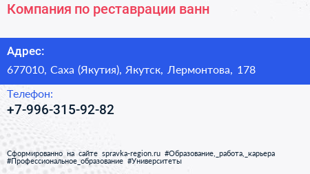 Компания по реставрации ванн по адресу 677010, Саха (Якутия), Якутск, Лермонтова, 178 в дальнейшем Организация, размещена в следующих категориях: