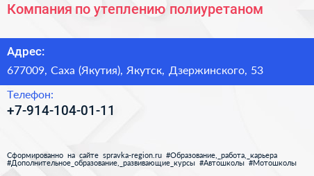 Компания по утеплению полиуретаном по адресу 677009, Саха (Якутия), Якутск, Дзержинского, 53 в дальнейшем Организация, размещена в следующих категориях: